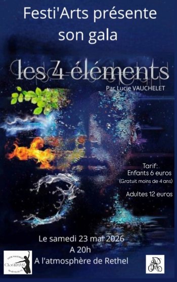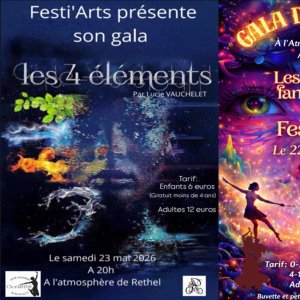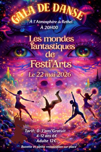 2026-05-22 20:00:00 2026-05-23 23:00:00 Europe/Paris Galas de danses du Vendredi 22 mai et Samedi 23 mai Reservations on : https://www.billetweb.fr/galas-de-danses-du-vendredi-22-mai-et-samedi-23-mai-i-6-juin --                        Vendredi.             LES MONDES FANTASTIQUES Chorégraphies réalisées par: - Floriane Trouvain (Danse Contemporaine) -Alice Creyelman (Majorette) -Yoan Crémon (Breakdance) -Virginie Gaillet(Danse Orientale)                           Samedi.                 LES 4 ELEMENTS:   Chorégraphies réalisées par: -Lucie Vauchelet (Eveil corporel/Eveil à la danse/Modern Jazz / Heels)   L'Atmosphère, Boulevard de la 4E Armée, Rethel, France FESTI'ARTS
