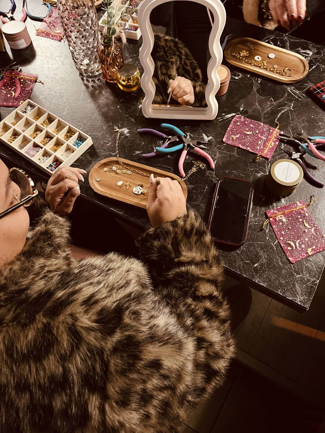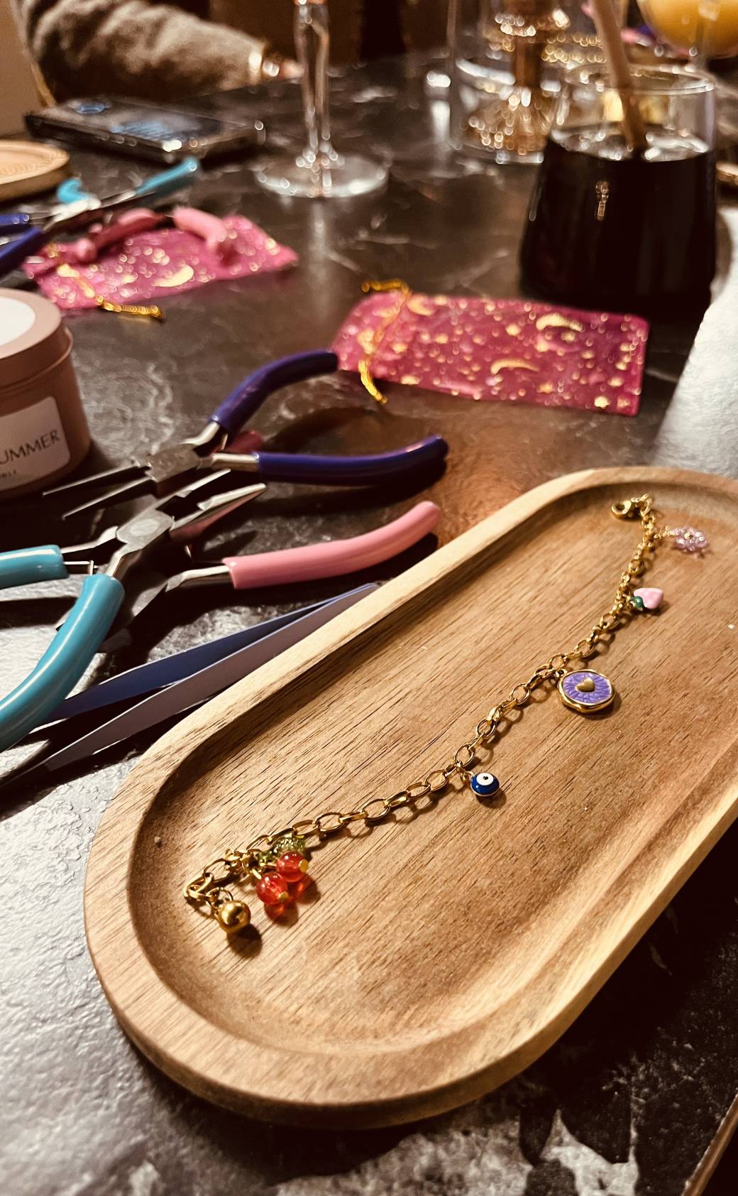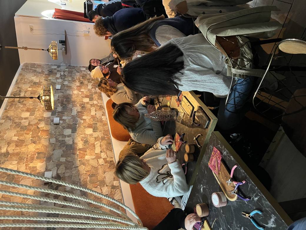 Tu arrives, la musique est douce, l’ambiance est chaleureuse, les filles discutent, rient… et toi, tu t’installes pour créer ton bijou personnalisé au bar à charms ✨