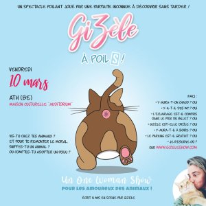 2023-03-10 20:00:00 2023-03-10 22:00:00 Europe/Brussels GiZèle "À PoilS !" à Ath Reservations on : https://www.billetweb.fr/gizele-poils-a-ath -- Le pitch ! Vivre avec des animaux, c’est génial, et on les adore ! Mais ! Mais ... il faut avouer que ça comporte quelques contraintes et ça demande plusieurs aménagements au quotidien ... comme être équipé de rouleaux d’essuies-tout par exemple .... GiZèle vous parlera de bien des choses : d’amour, de découvertes, et elle ne fera pas l’impasse sur les désagréments nauséabonds, parce que tout le monde doit TOUT savoir en adoptant un animal ! Mieux vaut être prêt psychologiquement avant, que d’avoir la surprise pendant .... Alors, venez le coeur bien accroché pour rire durant une heure trente, à un très gros poil près !   Un poil attendrissant, un poil cracra, une touffe de poils déjanté !  Un one woman show poilant qui sensibilise le public sur le ton de l’humour, et qui soutient les animaux ♥Spectacle à partir de 12 ans min.  Salle "Auditorium" Rue du Gouvernement (Tour Burbant), Ath, Belgique Gizèle Show