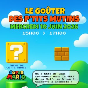 Cette année, le goûter des P'tits Mutins entre dans une nouvelle dimension : celui de l'univers Mario. Enfilez vos plus beaux déguisements pour partager avec nous ce moment festif ! Des animations rythmeront l'après-midi, à l'instar de ce que nous avons l'habitude de faire (jeux ludiques, maquillage, sculptures sur ballons).