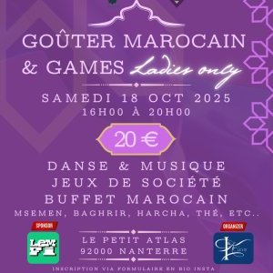 2025-10-18 16:00:002025-10-18 20:00:00Europe/ParisGoûter Marocain & Games - Ladies Only by IKEventsReservations on : https://www.billetweb.fr/gouter-marocain-games-ladies-only-by-ikevents