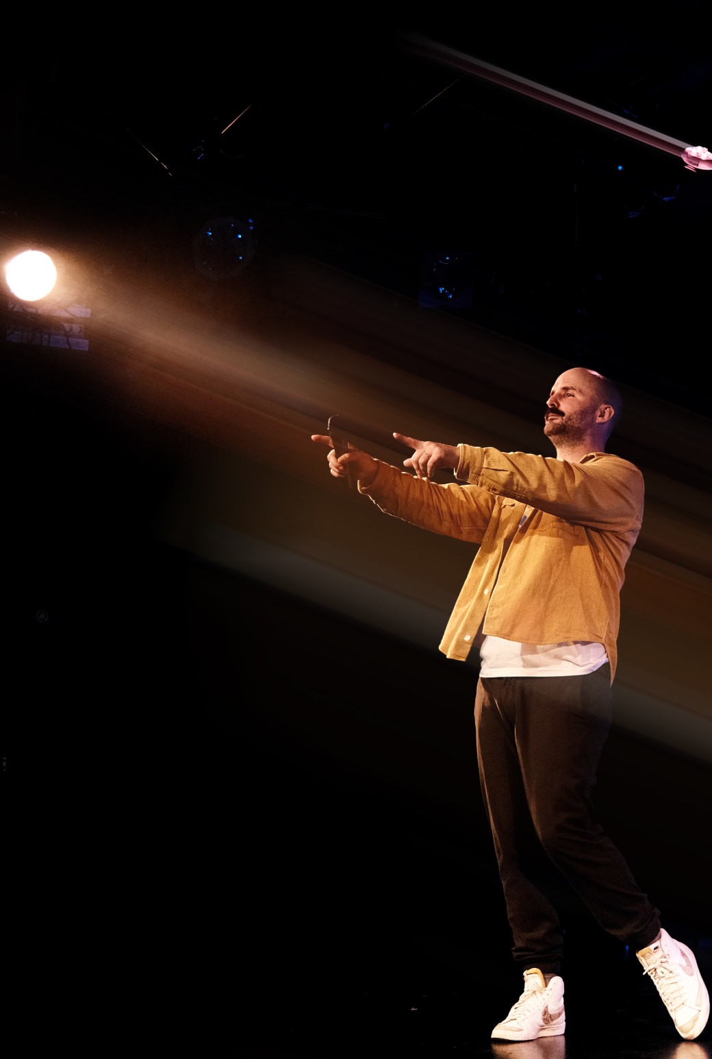 Il n'allait pas faire la description détaillée du spectacle. Personne ne lisait les descriptions. Si vous avez cliqué sur une affiche avec un oeuf au plat, c'est que vous avez déjà décidé de venir, ou alors vous avez une dalle de poney. Dans les deux cas, il savait qu'il était inutile d'essayer de vous convaincre qu'il était encore plus marrant en vrai, que ce spectacle était différent chaque soir car les sketchs étaient tirés au sort par le public, et qu'il faisait du stand-up, des personnages et bien d'autres choses encore... Il espérait que les “...” éveilleraient votre curiosité.