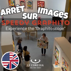 En collaboration avec la galerie Le Comoedia, lieu chargé d’histoire ayant successivement été théâtre puis cinéma avant de devenir galerie d’art, Speedy Graphito a conçu sa rétrospective, « Arrêt sur images », comme une expérience pleinement immersive. Le visiteur a ainsi le sentiment de traverser un film retraçant plus de 40 ans de création : son « Graphitoscope ».