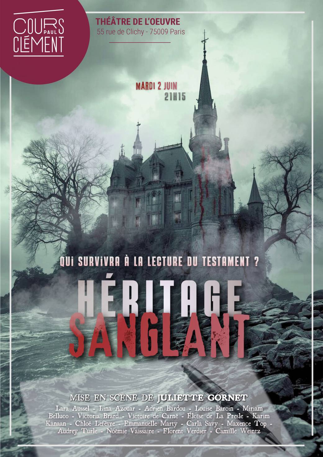 AUSSEL Lara - AZOUAR Lina - BARDOU Adrien - BAROIN Louise - BELLUCO Miriam - BRARD Victoria - DE CARNÉ Victoire - DE LA PRESLE Eloïse - KANAAN Karim - LEFEVRE Chloe - MARTY Emmanuelle - SAVY Carla - TOP Maxence - TURLE Audrey - VAISSAIRE Noémie - VERDIER …Théâtre de l'Œuvre, Rue de Clichy, Paris, FranceCours Clément