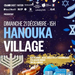2025-12-21 15:00:00 2025-12-21 19:30:00 Europe/Paris Hanouka Village Reservations on : https://www.billetweb.fr/hanouka-village2025 -- Des beignets tout chauds et tout sucrés, une hanoukia spectaculaire,  des stands de jeux : roulette, poker, baby-foot, ping-pong,  des ateliers pour laisser parler ta créativité : décoration de hanoukia et peinture sur toile.  Venez découvrir le Hanouka Village ! Une ambiance exceptionnelle & un programme bien chargé  On t'attend le dimanche 21 décembre à 15h à Hanouka Village pour allumer la dernière bougie de notre fête des miracles ! Paf 15€ Pour les 20-30 ans Inscription obligatoire : olami-cadet-nation.fr Olami Nation   Olami Nation Olami Nation