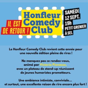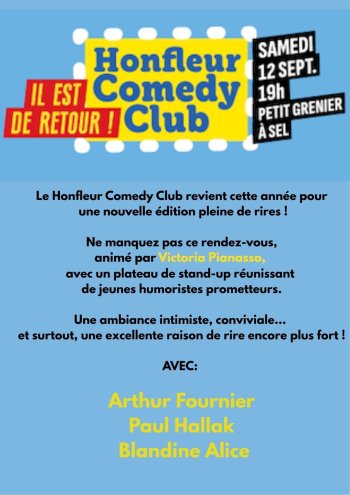 2026-09-12 19:00:00 2026-09-12 19:00:00 Europe/Paris HONFLEUR COMEDY CLUB Reservations on : https://www.billetweb.fr/honfleur-comedy-club --  ► OFFRE PACK SAMEDI : LE HONFLEUR COMEDY CLUB (19h) + LE SPECTACLE DE JESSE (20h30)- Ajouter à votre panier le spectacle de Jessé et bénéficiez de votre place au Honfleur Comedy Club au tarif de 5€ au lieu de 10€ !    Le Honfleur Comedy Club revient cette année pour une nouvelle édition pleine de rires !   Ne manquez pas ce rendez-vous, animé par Victoria Pianasso avec un plateau de stand-up réunissant de jeunes humoristes prometteurs.   Une ambiance intimiste, conviviale... et surtout, une excellente raison de rire encore plus fort !    AVEC: Arthur Fournier, Paul Hallack et Blandine Alice ! Les Greniers à Sel, Rue de la ville, Honfleur, France Festival Estuaire d'en Rire