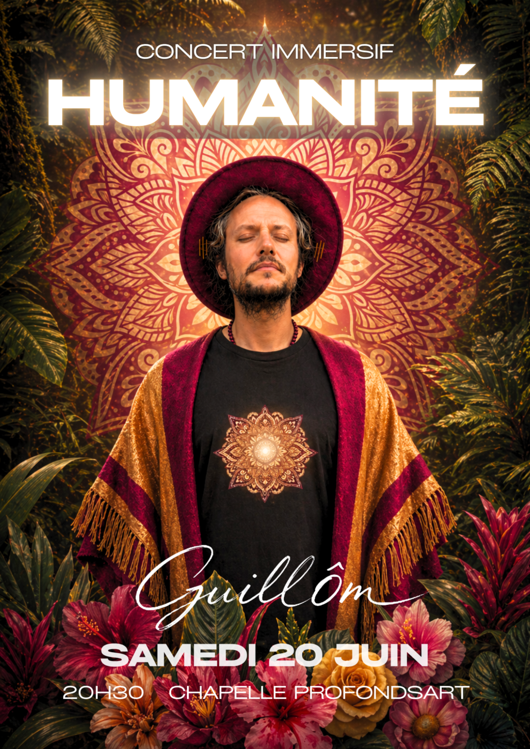 Porté par GuillÔm, auteur, compositeur et interprète, Humanité ouvre un temps suspendu où la scène devient cercle, où la chapelle devient forêt, où la chanson devient passage. Dans un univers visuel vibrant, entre mandala, lumière, souffle et matière vivante, le public est invité à vivre bien plus qu’un moment musical : une expérience sensible, profonde, presque initiatique.