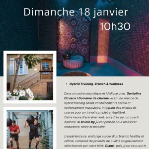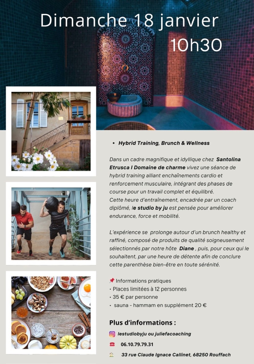 Dans un cadre magnifique au sein du doamine de charme Santolina Etrusca à Rouffach Julie et Diane vous accueillent le temps d'une parenthèse sportive, gourmande et bien-être ! Vivez une séance de HYBRID TRAINING alliant enchaînements cardio et renforcement musculaire et intégrant des phases de course à pied pour un travail complet et équilibré. Cette heure d'entraînement, encadrée par Julie, coach diplomée et fondatrice du Studio by Ju est pensée pour améliorer endurance, force et mobilité.
