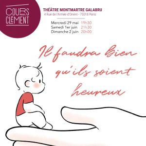 2024-05-29 19:30:00 2024-06-02 20:00:00 Europe/Paris Il faudra bien qu'ils soient heureux Reservations on : https://www.billetweb.fr/il-faudra-bien-quils-soient-heureux -- Une série d'histoires explorant la relation entre parents et enfants, mettant en scène des personnages à la fois forts et fragiles, d'une humanité frappante. Sans aucun jugement moral, ils interrogent la norme sociale d'un impossible modèle idéal de bonheur familial.   Une pièce de Mohid ABID. Avec : Cyndie BOUDEAU ; Gwénaëlle BULTEZ ; Chloé DEY; Manon DUNOYER ; Julia GOIGOUX ; Jana HAMMOUD ; Manon LAMBERT ; Maud PAILLE ; Benjamin PARIENTE ; Jean-Pierre RIZZI ; Vincent ROUSSEAU ; Laurène SARRADIN. Le Cours Clément, cours de théâtre pour tous les niveaux (débutant à avancé) et toutes les envies (Théâtre, Cinéma, Impro, StandUp, Comédie Musicale ...). Plusieurs lieux dans Paris et cours d'essai gratuit à la rentrée ! Cours Clément Théâtre Montmartre Galabru, Rue de l'Armée d'Orient, Paris, France Cours Clément