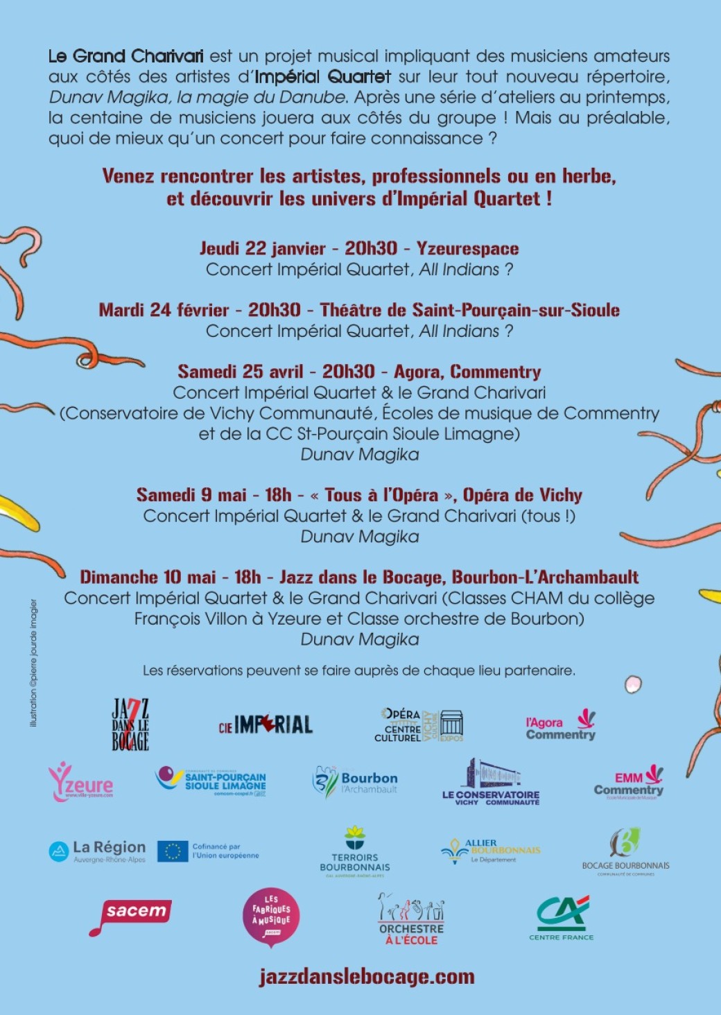 2026-04-25 20:30:00 2026-04-25 22:30:00 Europe/Paris Imperial Quartet & le Grand Charivari / Jazz dans le bocage Reservations on : https://www.billetweb.fr/imperial-quintet-jazz-dans-le-bocage -- IMPÉRIAL QUARTET & LE GRAND CHARIVARI   Avec les élèves du Conservatoire de Vichy Communauté, les Écoles de musique de Commentry et de la CC St-Pourçain Sioule Limagne   Le Grand Charivari, c’est un projet musical pendant lequel les artistes d’Impérial Quartet travaillent aux côtés de musiciens amateurs sur leur tout nouveau répertoire, Dunav Magika, la magie du Danube.  Après une série d’ateliers au printemps, la centaine de musiciens jouera aux côtés du groupe ! Mais au préalable, quoi de mieux qu’un concert pour faire connaissance ?  Venez rencontrer les artistes, professionnels ou en herbe, et découvrir les univers d’Impérial Quartet !    L'Agora OMPAC