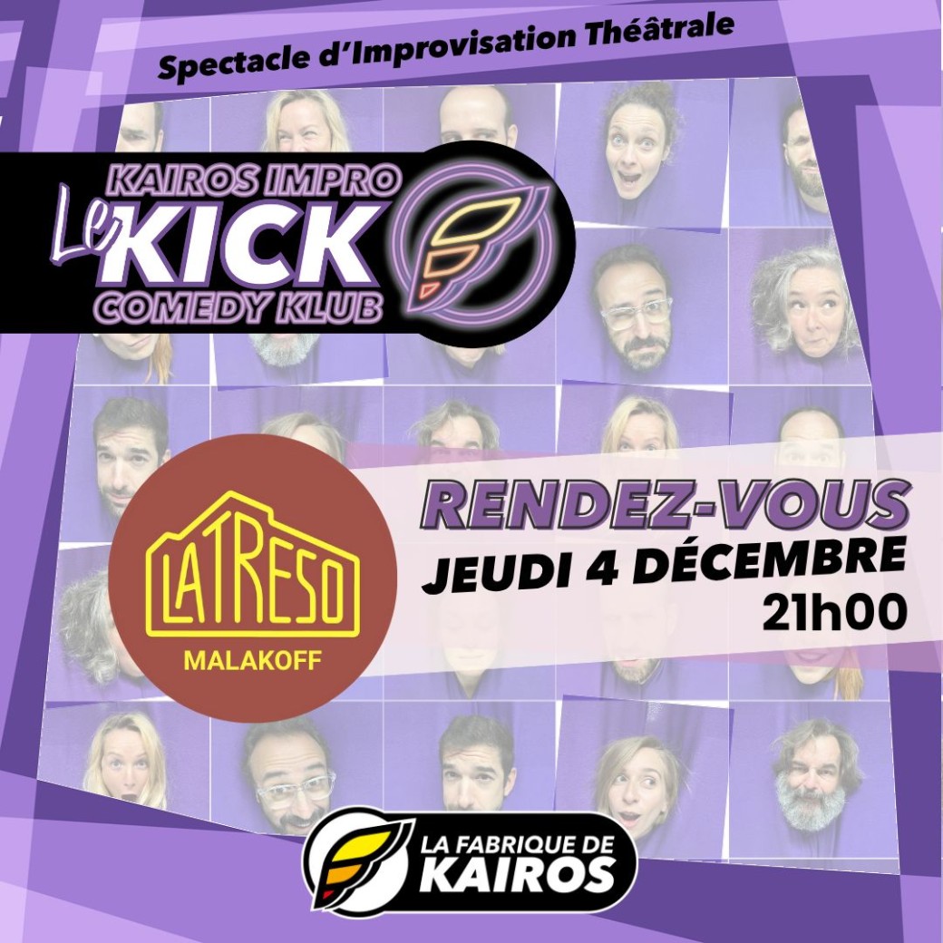 Venez voir, revoir, découvrir, redécouvrir de l'impro théâtrale à La Tréso avec le KICK, où les élèves des ateliers de la Fabrique se mélangent avec les profs pour partager la scène. Un spectacle haut en couleurs et en perspective.