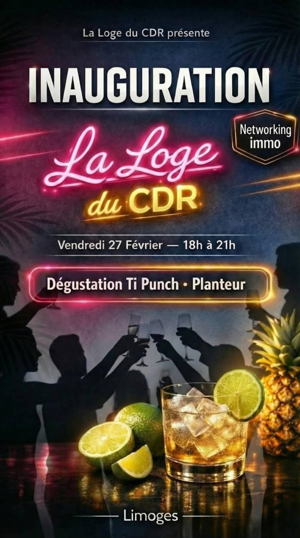 2026-02-27 18:00:00 2026-02-27 21:00:00 Europe/Paris INAUGURATION #LA LOGE DU CDR Reservations on : https://www.billetweb.fr/inauguration-la-loge-du-cdr -- On se retrouve dans l'ancienne loge d'un resto administratif qu'on a entièrement rénové! Esprit CDR au menu, avec Convivialité, échange et partage autour de l'invest et de l'immobilier! Pour ce premier RDV, la loge prendra des airs caribéens puisque je partirai ensuite en Guadeloupe!! On dégustera donc le Fameux TI PUNCH et le PLANTEUR (avec ou sans alcool) agrémenté de quoi picorer! L'endroit et le code d'accès au bâtiment sera envoyé par mail le jour de l'évent Limoges, France CDR Business Corporation