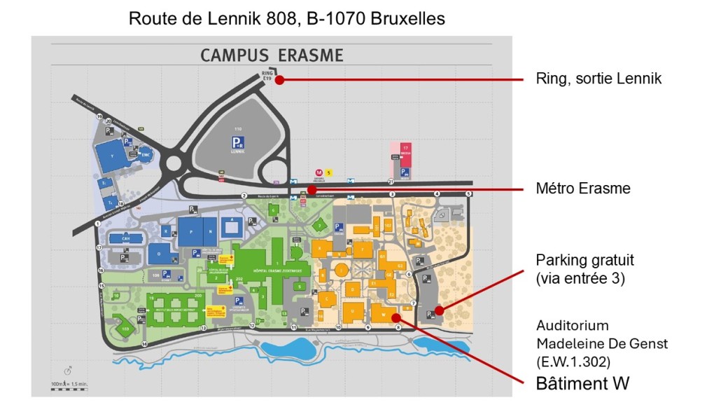 • Lieu : Auditoire E.W.1.302, Bâtiment W, Campus Erasme, Route de Lennik 808, B-1070 Bruxelles, Université Libre de Bruxelles (voir plan pour emplacement, parking gratuit et accès Métro Erasme)