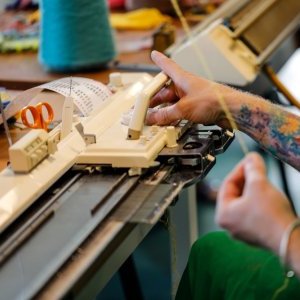 Caroline Petibon, enseignante de tricot machine au sein de son atelier ambulant Les Aiguilles Mécaniques, formée au tricot machine par Elfie Haas.