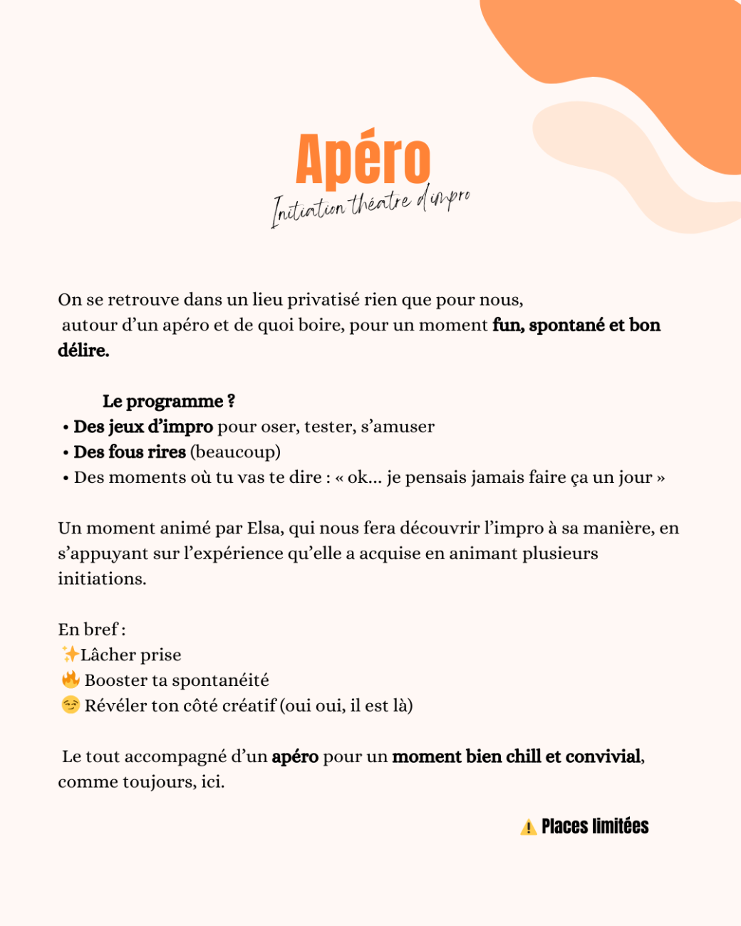 2026-04-09 19:30:00 2026-04-09 19:30:00 Europe/Paris Initiation théâtre d'impro Reservations on : https://www.billetweb.fr/initiation-theatre-dimpromptues --                                        ------------------------------   ⚠️ ATTENTION :   En cas d’annulation, le billet ne pourra être remboursé. Cependant, si tu souhaites l'offrir ou le revendre à une copine / sœur / collègue, ceci est possible. Quoi que tu décides, pense à me tenir informé de ta décision. Merci pour ta compréhension & hâte de te retrouver ! ✨ 7VB Café Mulhouse, Place de la République, Mulhouse, France Entre Elles