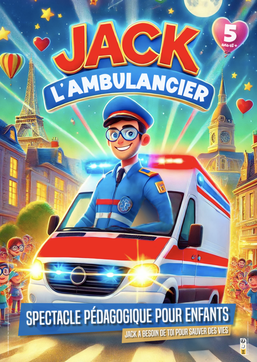 Viens t'amuser tout en apprenant les gestes qui peuvent sauver des vies ! Ce spectacle rigolo et pédagogique t'explique comment réagir si quelqu'un a un accident à la maison. Jack, le super ambulancier, va te montrer les gestes de premiers secours les plus importants. Avec lui, tu apprendras comment devenir un petit héros du quotidien, comme les vrais secouristes ! Jack a été ambulancier pour de vrai ! Il te montrera les bons gestes de secours avec des chansons pour que ce soit plus facile à retenir. Alors prêt(s) à devenir un super héros ?