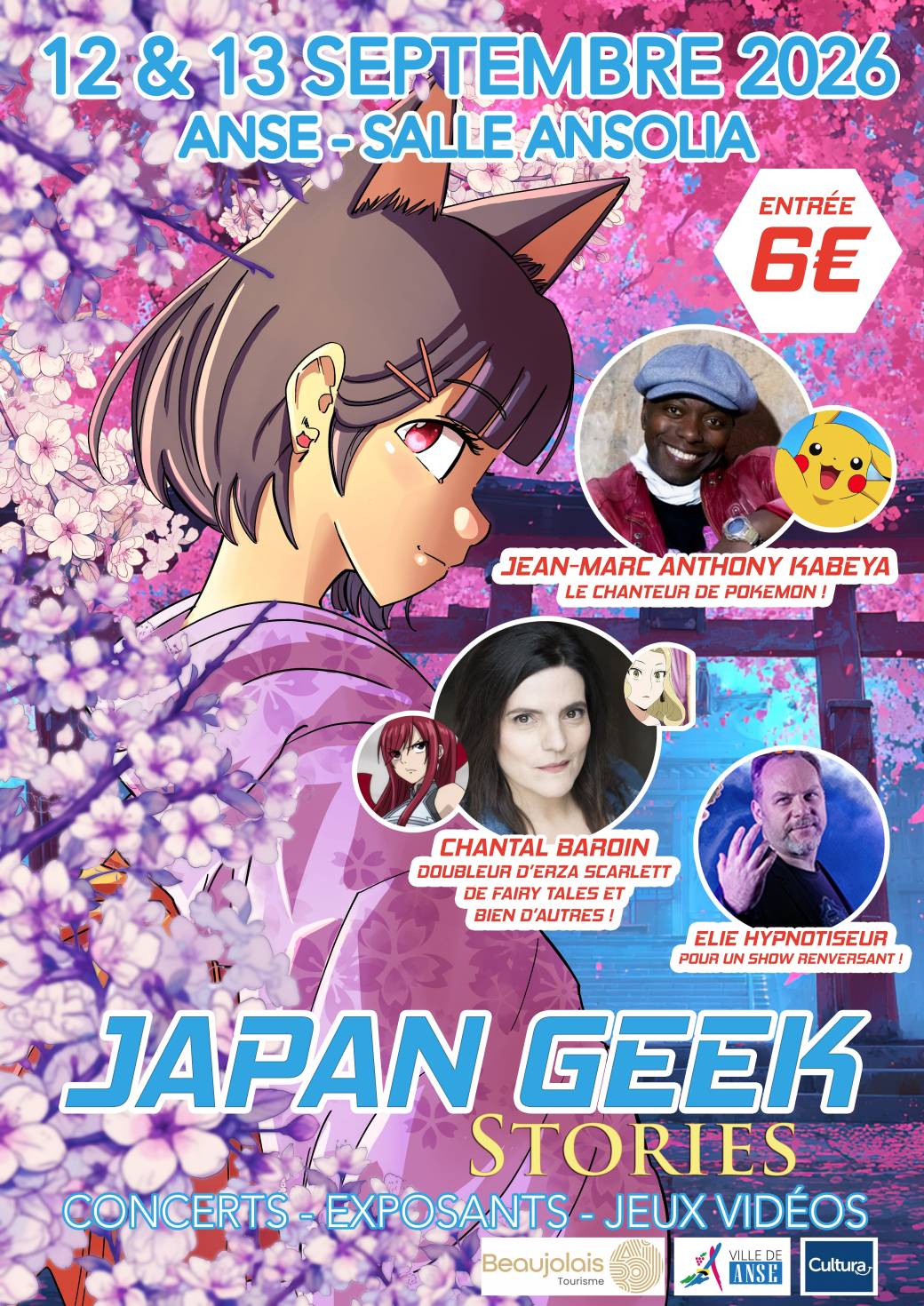 Japan Geek Stories vous donne rendez-vous le 12 et 13 Septembre à Anse à la Salle Ansolia, au Sud de Villefranche sur Saône. Manga, Animations, Jeux Vidéo, Cosplay, Concerts ... Jean Marc Anthony Kabeya donnera 4 concerts et sera présent pour vos dédicaces. Chantal Baroin, animera une cabine de doublage avec la participation des visiteurs, elle sera aussi en dédicaces. Spectable de catch cosplayé et initiation au catch sont programmés. Un espace arcades rétro sera installé en libre accès. Vous pourrez déguster des spécialités japonaises sur place.