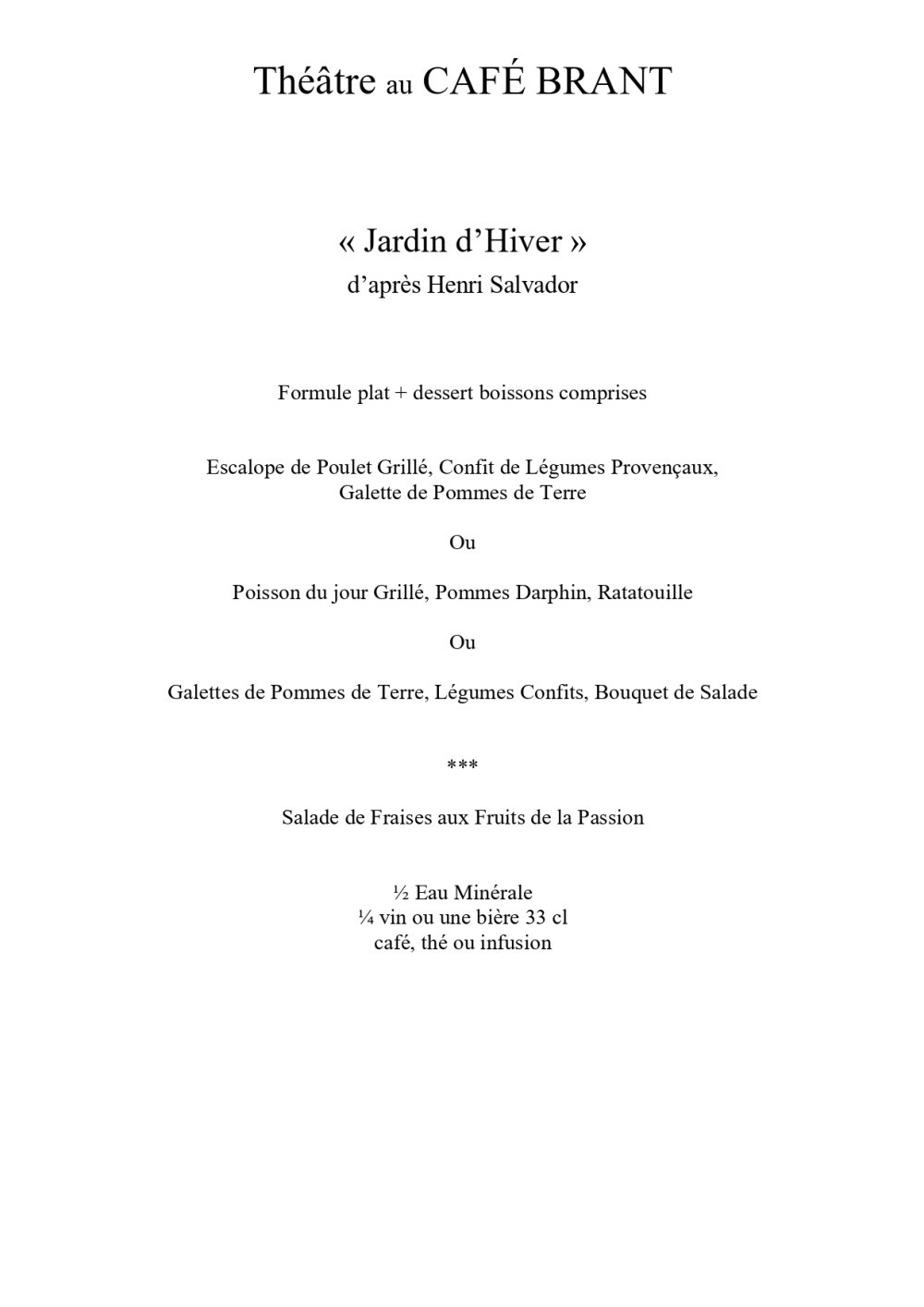 Plat à choisir (viande, poisson ou végétarien), ¼ vin ou bière 33 cl, ½ eau minérale, café, thé ou infusion.
