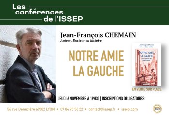 2025-11-06 19:30:00 2025-11-06 20:30:00 Europe/Paris Jean-François Chemain - Notre amie la gauche Reservations on : https://www.billetweb.fr/jean-francois-chemain -- M. Jean-François Chemain sera à l'ISSEP pour une conférence exceptionnelle autour de son livre '' Notre amie la gauche ''.  Préface de M. Mathieu Bock-Côté. Une séance de dédicace est prévue à l'issue de la conférence.    Le livre sera en vente sur place mais vous pouvez d'ores et déjà l'acheter ici et le retirer à votre arrivée.    A noter : Nos conférences ne seront plus diffusées en direct.  56 Rue Denuzière, Lyon, France ISSEP