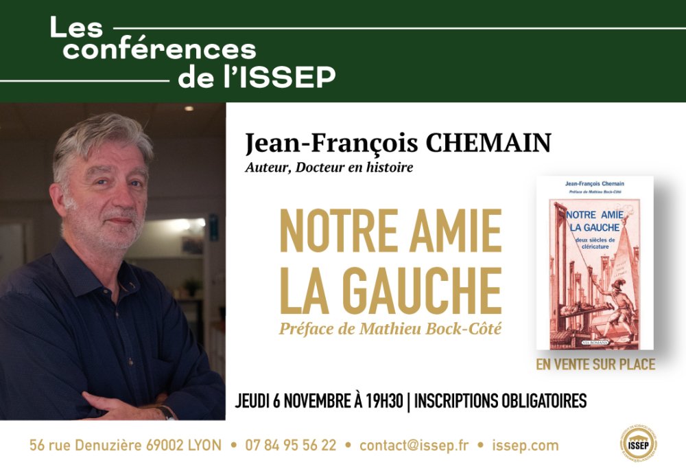 2025-11-06 19:30:00 2025-11-06 20:30:00 Europe/Paris Jean-François Chemain - Notre amie la gauche Reservations on : https://www.billetweb.fr/jean-francois-chemain -- M. Jean-François Chemain sera à l'ISSEP pour une conférence exceptionnelle autour de son livre '' Notre amie la gauche ''.  Préface de M. Mathieu Bock-Côté. Une séance de dédicace est prévue à l'issue de la conférence.    Le livre sera en vente sur place mais vous pouvez d'ores et déjà l'acheter ici et le retirer à votre arrivée.    A noter : Nos conférences ne seront plus diffusées en direct.  56 Rue Denuzière, Lyon, France ISSEP