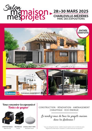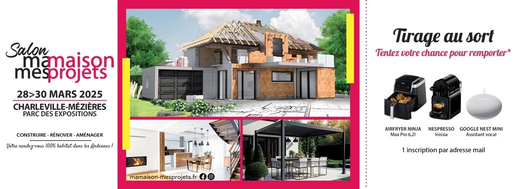 2025-03-01 08:00:00 2025-03-30 18:00:00 Europe/Paris Salon Ma Maison Mes Projets Charleville-Mézières 2025 Reservations on : https://www.billetweb.fr/jeu-concours-salon-ma-maison-mes-projets-charleville-mezieres -- Le salon Ma Maison Mes Projets gâte ses visiteurs ! Vous rêvez de remporter l'un de ces produits phares ? Alors tentez votre chance !   Pour participer, complétez le e-bulletin ci-dessous et scannez-le à l'entrée du salon pour valider votre participation définitive aux tirages au sort. Jeu sans obligation d'achat - 1 inscription par adresse mail : règlement téléchargeable   Description des cadeaux que vous pouvez tenter de gagner : Airfryer Ninja Max Pro 6,2l AF180EU - valeur 149,99€ TTC l’un des produits star de la cuisine en 2025 ! Nespresso Inissia - valeur 99€ TTC What else ? ;-) Une Google Nest Mini 2e Génération - 59€ TTC pour rester connecté :-)   Informations pratiques Salon : Date : 28 au 30 mars 2025 Lieu : Parc des Expositions, Rue de la Vieille Meuse, 08000 Charleville-Mézières Horaires : Vendredi & Samedi : 10h – 19h Dimanche : 10h – 18h Parking gratuit Restauration sur place ENTRÉE GRATUITE Liste des exposants & informations complètes sur : www.mamaison-mesprojet.f… Parc des Expositions, Rue de la Vieille Meuse, Charleville-Mézières, France IK COM