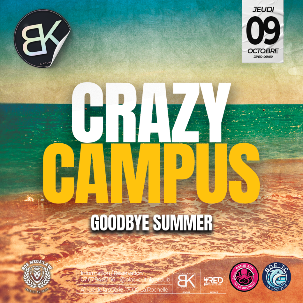 2025-10-09 23:30:002025-10-10 06:00:00Europe/ParisJeudi 09 Octobre - Crazy Campus : Goodbye Summer (avec BDE TC, Droit et Genie Bio)Reservations on : https://www.billetweb.fr/jeudi-09-octobre-crazy-campus-goodbye-summer