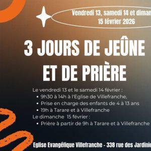 Le jeûne et prière vous est proposé du vendredi 13 au dimanche 15 février 2026. Chacun est libre de participer 1 ou plusieurs jours au choix.