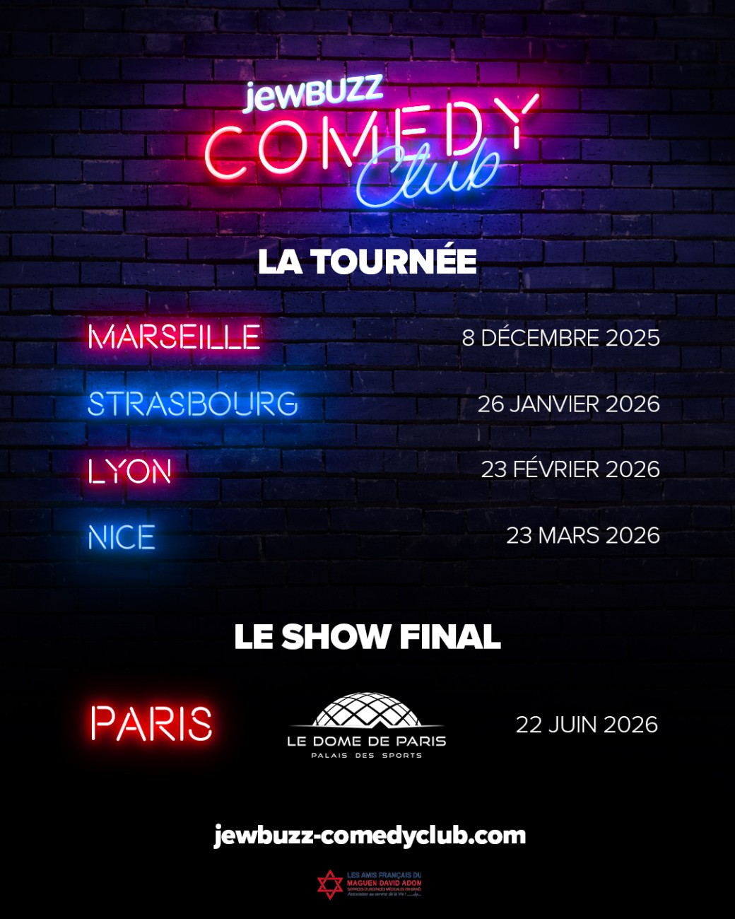 Nouvelle saison, nouveaux sketchs ! Le jewbuzz Comedy Club repart en tournée à Marseille, Strasbourg, Lyon et Nice, pour terminer en beauté avec un show final exceptionnel au Dôme de Paris !