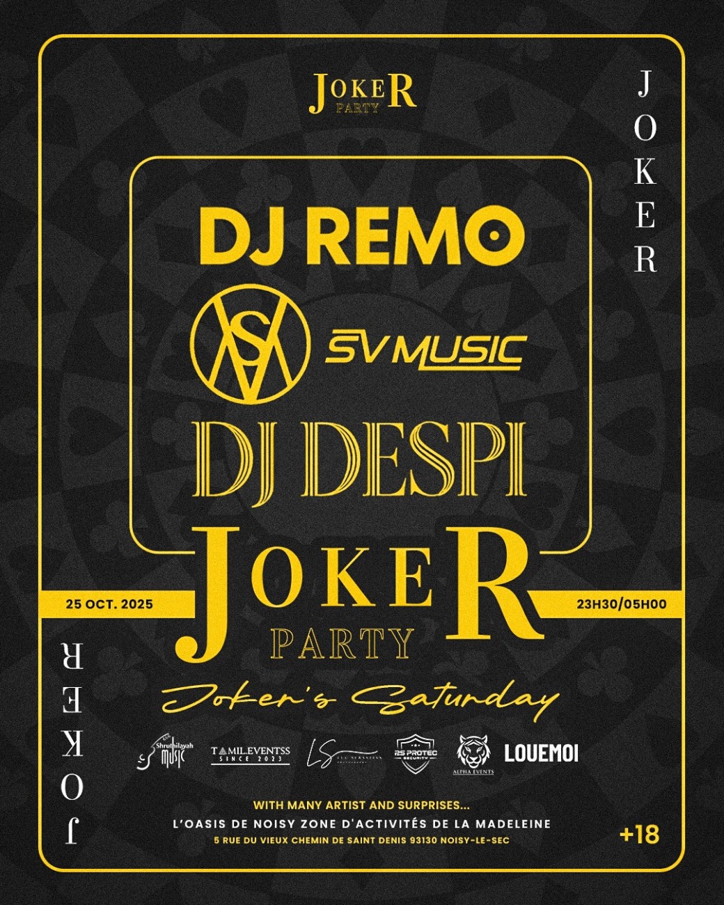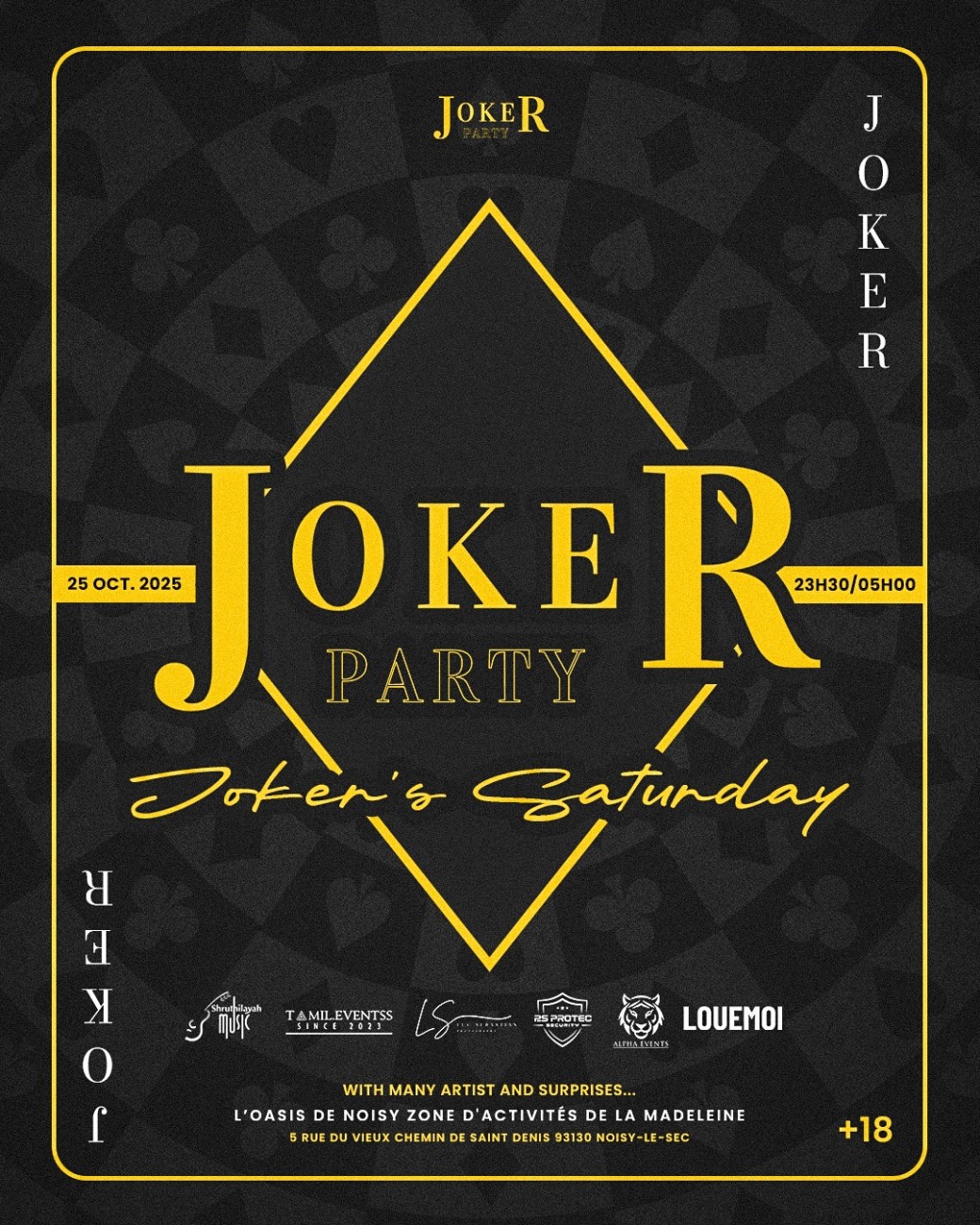 2025-11-29 23:00:002025-11-30 05:00:00Europe/ParisJOKER PARTYReservations on : http://www.shruthilayah.com