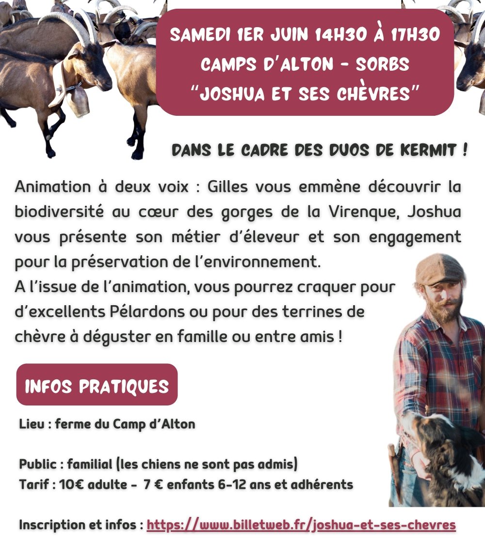 Animation à deux voix : Gilles vous emmène découvrir la biodiversité au coeur des gorges de la Virenque, Joshua vous présente son métier d’éleveur et son engagement pour la préservation de l’environnement.