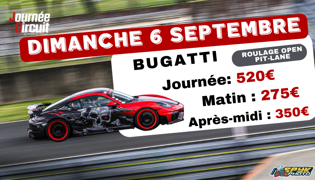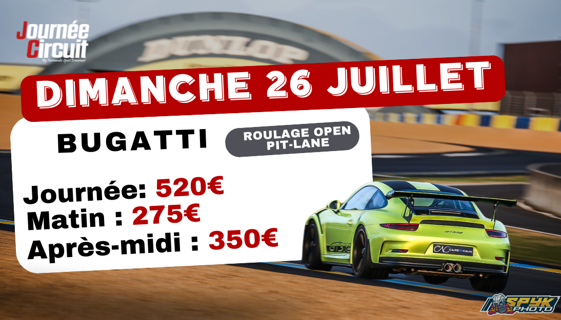 2026-03-01 08:00:00 2026-03-01 18:00:00 Europe/Paris Journée Circuit Bugatti Dimanche 1er Mars 2026 Reservations on : https://www.billetweb.fr/journee-circuit-bugatti-dimanche-1er-mars-2026 -- Open Pit Lane -> pas de session sauf la session femmes -> piste réservée 15 min de 14h à 14h15. 30 voitures max en même temps sur le circuit de 4,185 km. ⚠️ Conditions de participation Véhicules acceptés : cliquez ici  Limite sonore : 100 dB Permis B obligatoire +18 ans (licence non acceptée)  Assurance RC Circuit obligatoire  Équipements conformes au règlement FFSA Décharge à remplir en ligne avant la journée ✅ Inclus avec votre inscription 1 voiture + 1 pilote + 3 accompagnants (non passagers) Coaching découverte/débutant Open bar toute la journée Assistance mécanique sur place ➕ Options disponibles Pilote supplémentaire Passager (+16 ans) RC Circuit  Photos souvenirs Location équipement (casque, combinaison, HANS) Transport véhicule Réservation box (auprès du circuit) (-> Souscrire une option oubliée après inscription ) ℹ️ Infos pratiques -> Formulaire PMR -> Formulaire annulation ou revente  -> Souscrire à une assurance annulation Vous changez de véhicule -> Prévenez-nous par mai… Circuit Bugatti, Le Mans, France Normandie Sport Evenement