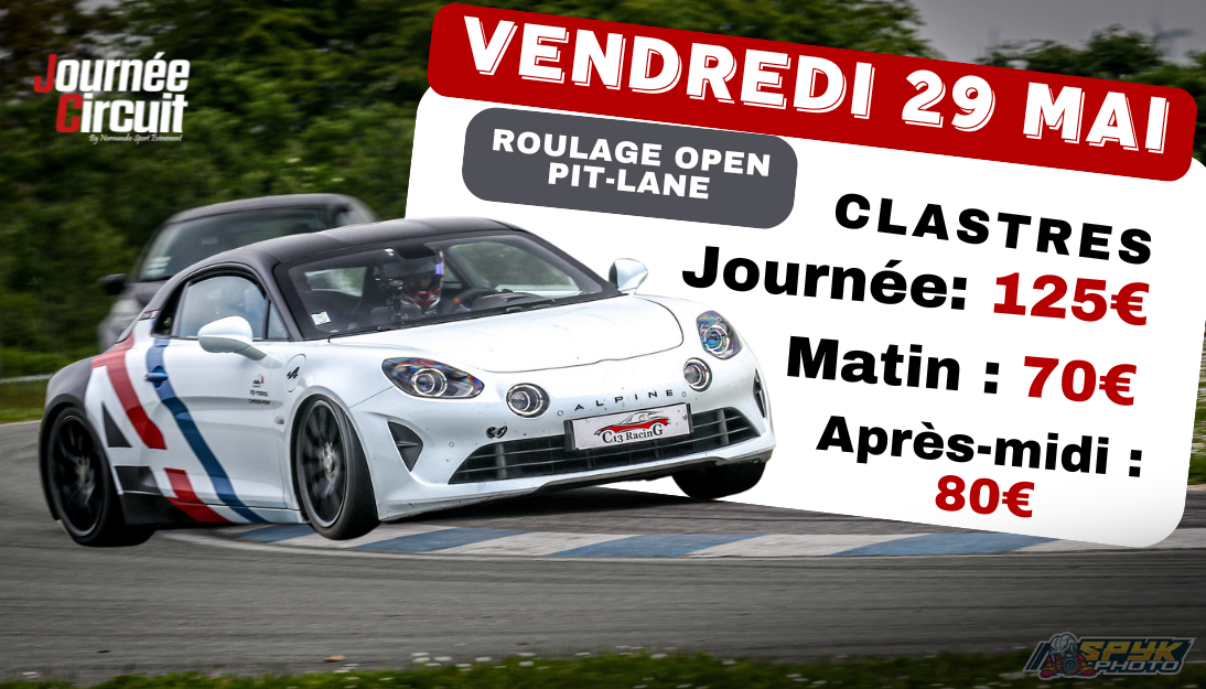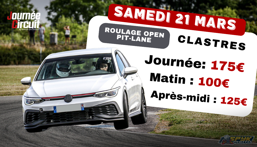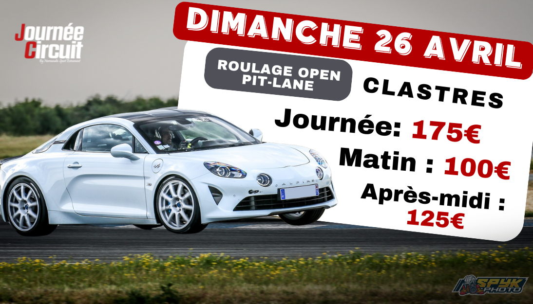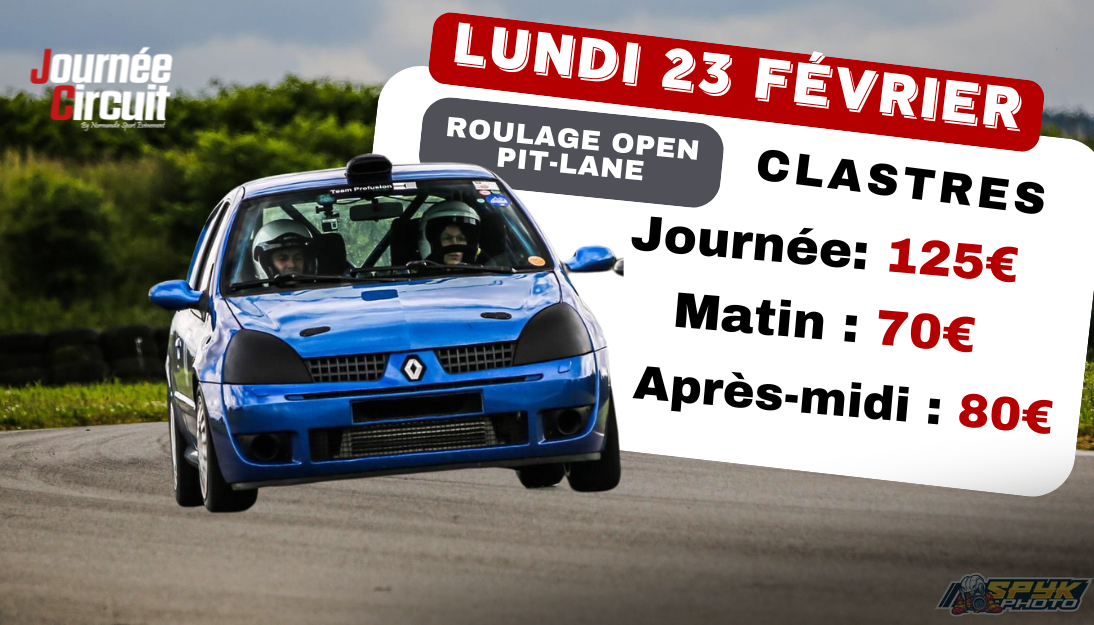 2026-01-26 08:00:00 2026-01-26 17:00:00 Europe/Paris Journée Circuit Clastres lundi 26 Janvier 2026 Reservations on : https://www.billetweb.fr/journee-circuit-clastres-lundi-26-janvier-2026 -- Open Pit Lane -> pas de session sauf la session femmes -> piste réservée 15 min de 13h30 à 13h45. 24 voitures max en même temps sur le circuit de 2.4km. ⚠️ Conditions de participation Véhicules acceptés : cliquez ici  Limite sonore : 95 dB Permis B (licence non acceptée)  Assurance RC Circuit obligatoire  Équipements conformes au règlement FFSA Décharge à remplir en ligne avant la journée ✅ Inclus avec votre inscription 1 voiture + 1 pilote Coaching découverte/débutant Open bar toute la journée Assistance mécanique sur place ➕ Options disponibles Pilote supplémentaire Passager (+16 ans) RC Circuit  Photos souvenirs Location équipement (casque, combinaison, HANS) Transport véhicule (-> Souscrire une option oubliée après inscription ) ℹ️ Infos pratiques -> Formulaire annulation ou revente  -> Souscrire à une assurance annulation Vous changez de véhicule -> Prévenez-nous par mail.    -> Formule All-in Coaching + accès piste prioritaire disponible en contactant guillaume au 0638685961. (… Circuit Clastres, Clastres, France Normandie Sport Evenement