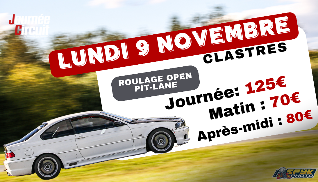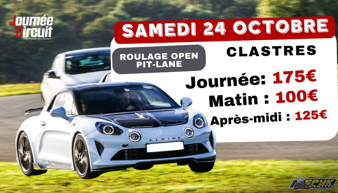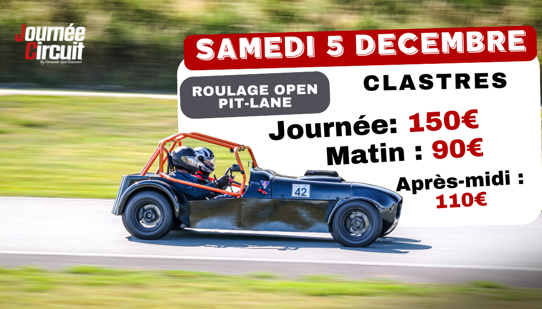 2026-10-02 08:00:00 2026-10-02 17:00:00 Europe/Paris Journée Circuit Clastres vendredi 2 octobre 2026 Reservations on : https://www.billetweb.fr/journee-circuit-clastres-vendredi-2-octobre-2026 -- Open Pit Lane -> pas de session sauf la session femmes -> piste réservée 15 min de 13h30 à 13h45. 24 voitures max en même temps sur le circuit de 2.4km. ⚠️ Conditions de participation Véhicules acceptés : cliquez ici  Limite sonore : 95 dB Permis B (licence non acceptée)  Assurance RC Circuit obligatoire  Équipements conformes au règlement FFSA Décharge à remplir en ligne avant la journée ✅ Inclus avec votre inscription 1 voiture + 1 pilote Coaching découverte/débutant Open bar toute la journée Assistance mécanique sur place ➕ Options disponibles Pilote supplémentaire Passager (+16 ans) RC Circuit  Photos souvenirs Location équipement (casque, combinaison, HANS) Transport véhicule (-> Souscrire une option oubliée après inscription ) ℹ️ Infos pratiques -> Formulaire annulation ou revente  -> Souscrire à une assurance annulation Vous changez de véhicule -> Prévenez-nous par mail.    -> Formule All-in Coaching + accès piste prioritaire disponible en contactant guillaume au 0638685961. (… Circuit Clastres, Clastres, France Normandie Sport Evenement