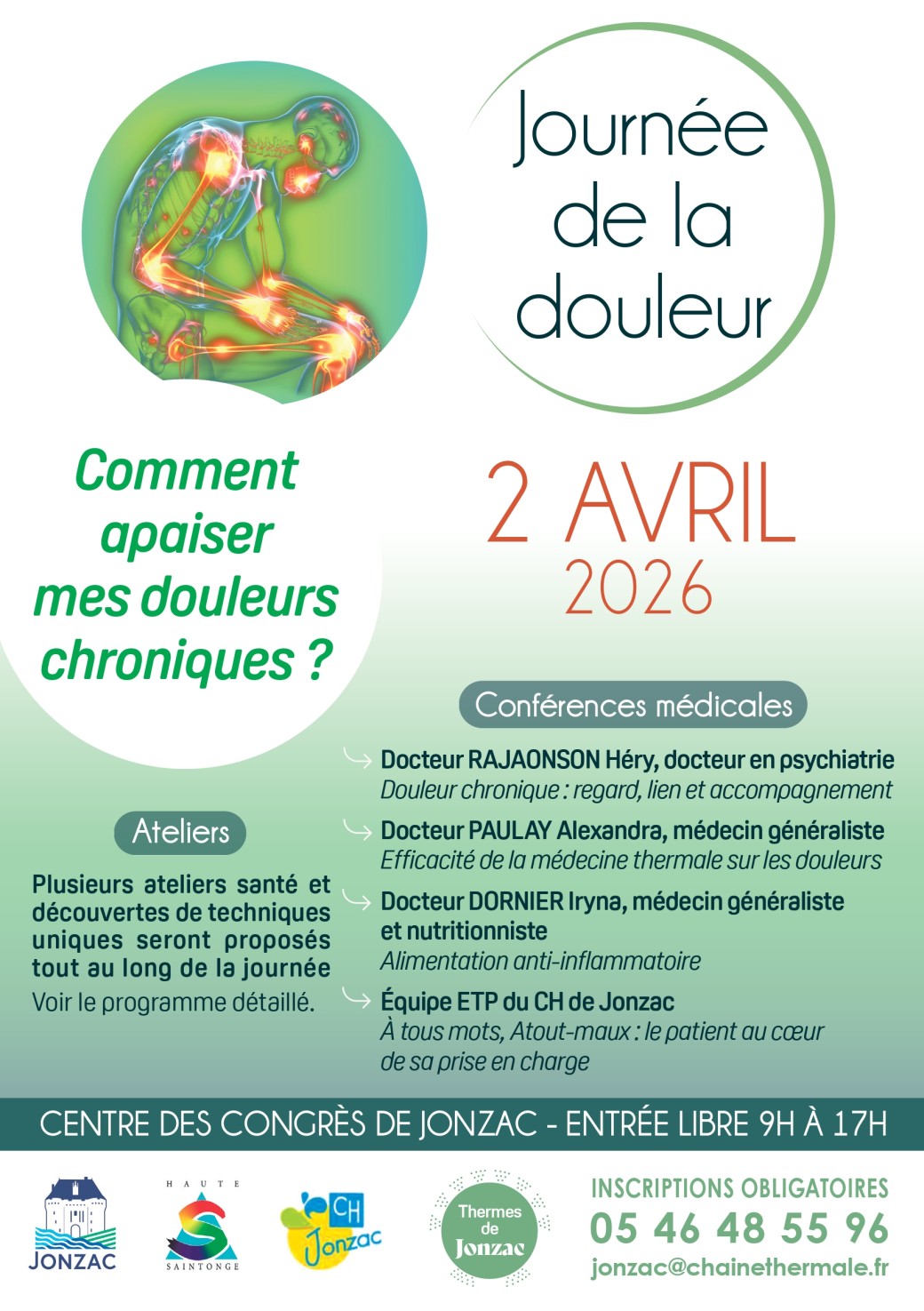 Ne manquez pas l'événement exceptionnel de la 1ère édition ! Organisée par les Thermes et l'hôpital de Jonzac, cette journée unique est dédiée à la gestion des douleurs chroniques. Profitez de conférences et d'ateliers animés par des médecins spécialistes et des experts en santé du territoire de la Haute-Saintonge pour découvrir des solutions concrètes pour apaiser vos douleurs.