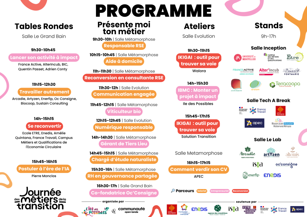 Au programme : Tables Rondes, Conférences, Témoignages, Ateliers et Interlude Artisitique pour vous aider à monter votre projet, vous former à la transition, vous orienter vers des métiers de sens, rejoindre une structure engagée ou faire bouger les lignes de votre entreprise.