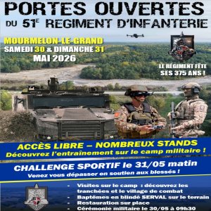 Le 51e régiment d'infanterie vous ouvre ses portes au quartier Gallieni à Mourmelon-le-Grand. Venez découvrir les moyens d'entraînement sur le camp militaire et participer à de nombreuses activités !