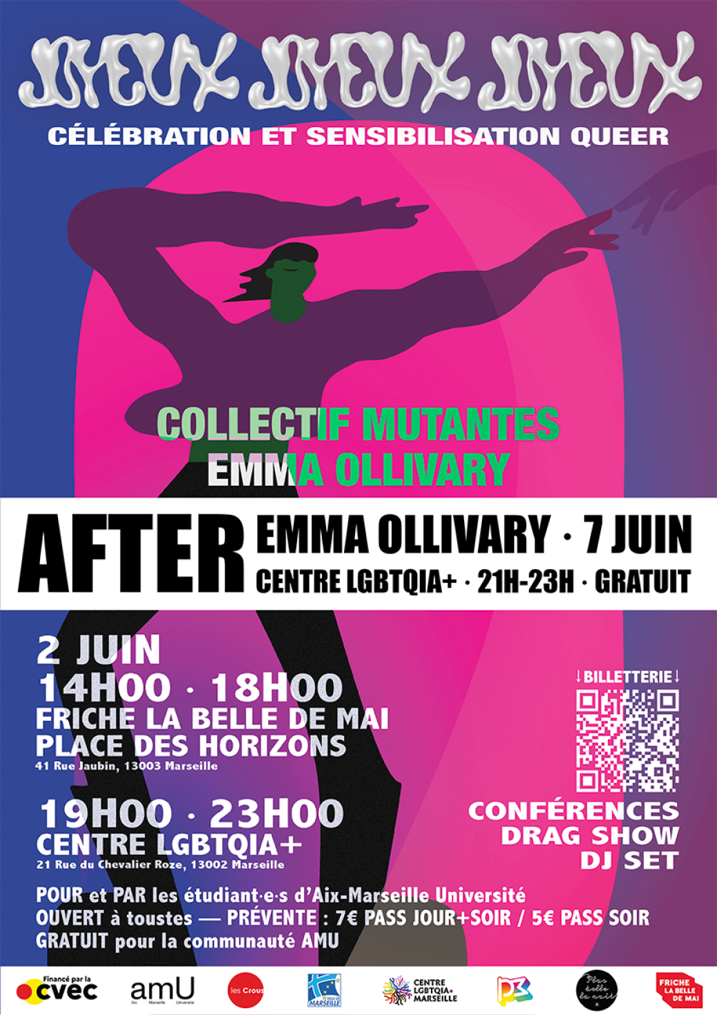 Joyeux Joyeux Joyeux c’est un événement de célébration et de sensibilisation autour des identités queer. Le 2 juin 2025 à la Place des Horizons de la Friche La Belle de Mai, retrouvez deux conférences :