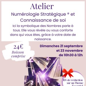 A l'issue de l'atelier, une réduction de 10% sera offerte aux participants pour la réservation d'un thème de numérologie dit "Essentiel" soit une restitution de 3H. Offre valable maximum 3 mois après l'atelier.