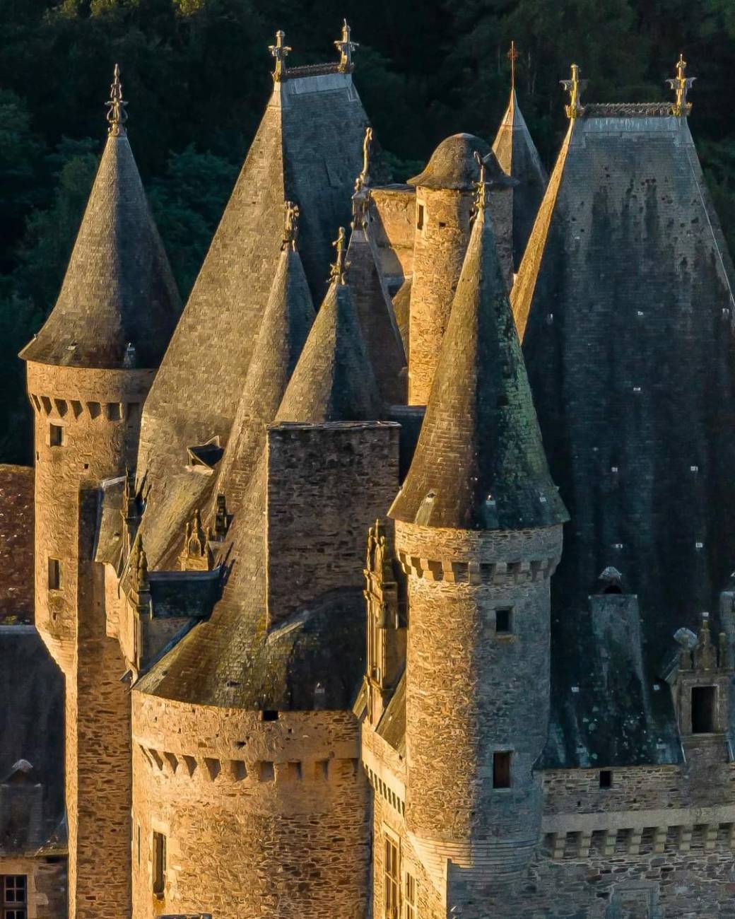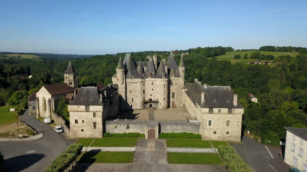 Aux confins du Périgord et du Limousin, cette forteresse, bâtie sur un territoire aurifère aux XIIème, XIIIème et XVème siècles, fut attaquée successivement par Richard Cœur de Lion, le Prince Noir et Duguesclin, avant d'être transformée à la Renaissance et hérissée de toitures féeriques ornées de faîtières aux symboliques féodales et alchimiques.
