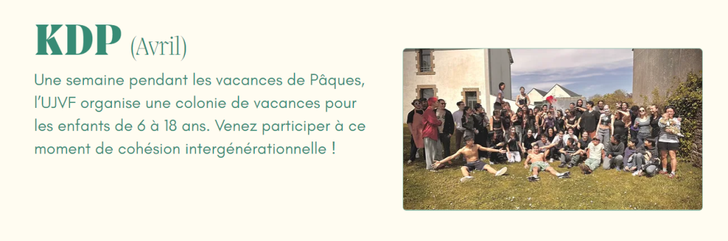 Le Camp de Pâques (KDP) est un camp d’activités et d’études pour les jeunes du CP à la Terminale. Il a lieu tous les ans pendant les vacances scolaires d'avril (zone C), et dure 9 jours (8 nuits).