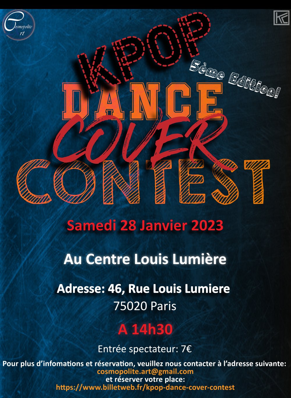 2023-01-28 14:30:00 2023-01-28 17:30:00 Europe/Paris KPOP DANCE COVER CONTEST 2023 Reservations on : https://www.billetweb.fr/kpop-dance-cover-contest -- LE CENTRE PARIS ANIM’ LOUIS LUMIÈRE, Rue Louis Lumière, Paris, France Cosmopolite Art