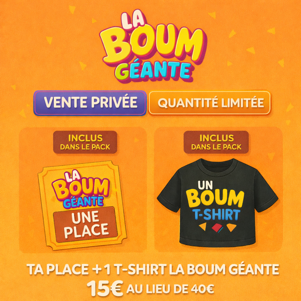 Les personnes ayant cliqué sur “Envoyer-moi un rappel” recevront un email dès l’ouverture de la billetterie avec une offre de lancement exclusive, disponible pendant une durée limitée. 1 T-Shirt Boum Géante + ta Place