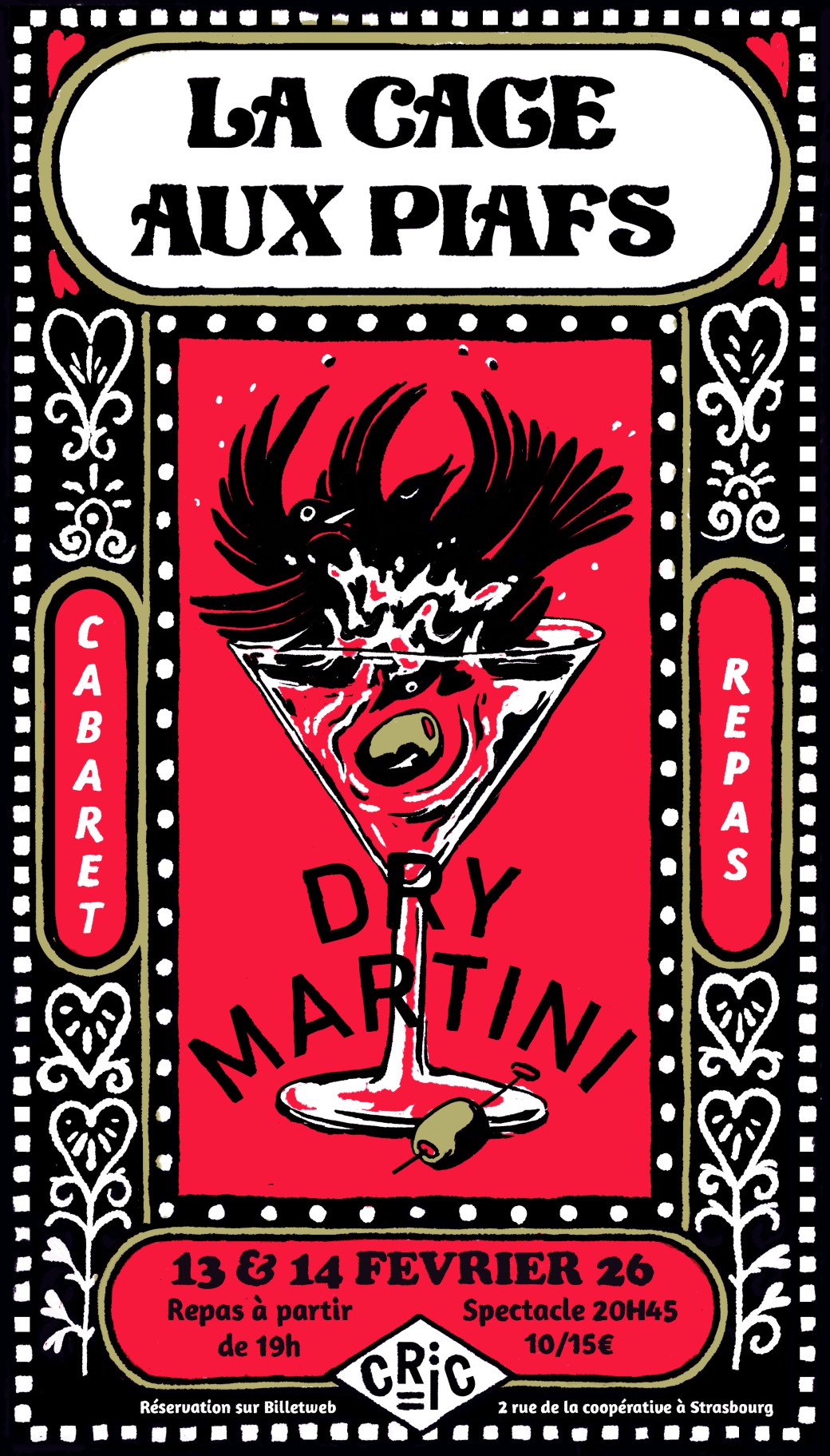 2026-02-13 19:00:00 2026-02-13 23:00:00 Europe/Paris La Cage aux Piafs - 13 Février à 20h45 (Repas à 19h) Reservations on : https://www.billetweb.fr/la-cage-aux-piafs-13-fevrier-a-20h -- Chers tourtereaux, chers vautours solitaires,   Le temps d’un dîner, La Plume, La Cuica et La Chose font le tour du monde en musique, direction le pays de l'amour ! Des États-Unis au Brésil, en passant par la France, l’Italie et l’Espagne, les Piafs chantent en plusieurs langues les amours perdus, les amours fous ou aigres-doux, les décollages et atterrissages forcés, les espoirs permis et ceux qu’on noie dans son Martini. Un cocktail détonnant à base d’arrangements jazz et pop d’airs connus, de poésie et d’une bonne dose d’humour.   19h: Ouverture des portes et restauration spéciale Saint-Valentin (non obligatoire) 20h45: Spectacle "Dry Martini" par La Cage aux Piafs 22h: Dessert et philtre d'amour   Aux commandes: Marie Storup pour le plaisir des papilles La Plume, La Cuica et La Chose pour le plaisir des oreilles et des yeux.   Décollage imminent pour le pays de l'amour !  Réservation sur billetweb possible jusqu'à 20h45 le jour du spectacle ou caisse du soir (uniquement li… Le Cric, 2 Rue de la Coopérative, 67000 Strasbourg, France La Cage aux Piafs