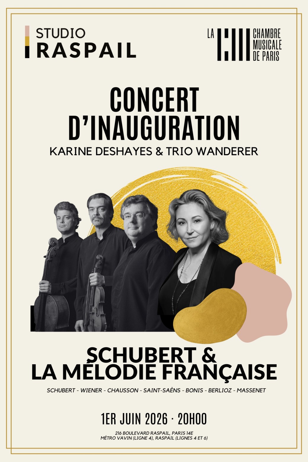 Autour de Karine Deshayes et du Trio Wanderer, le programme met en regard deux univers étroitement liés par leur attention au texte et à l’expression : celui de Franz Schubert et celui de la mélodie française. Du lyrisme ample du Trio op. 100 aux lignes suspendues du Notturno, des élans de Ganymed aux tensions dramatiques de Gretchen am Spinnrade, Schubert explore différentes manières de faire dialoguer la voix et les instruments, du chant le plus direct aux formes plus méditatives.