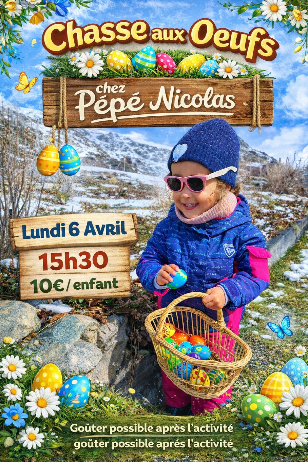 Et ce n'est pas fini ! Après la chasse aux œufs, vous aurez la possibilité de savourer nos délicieux goûters. Dégustez nos gaufres croustillantes, nos brioches perdues moelleuses, nos sablés aux myrtilles fondants, nos glaces et sorbets maison rafraîchissants, ainsi qu'une sélection de boissons chaudes et froides.