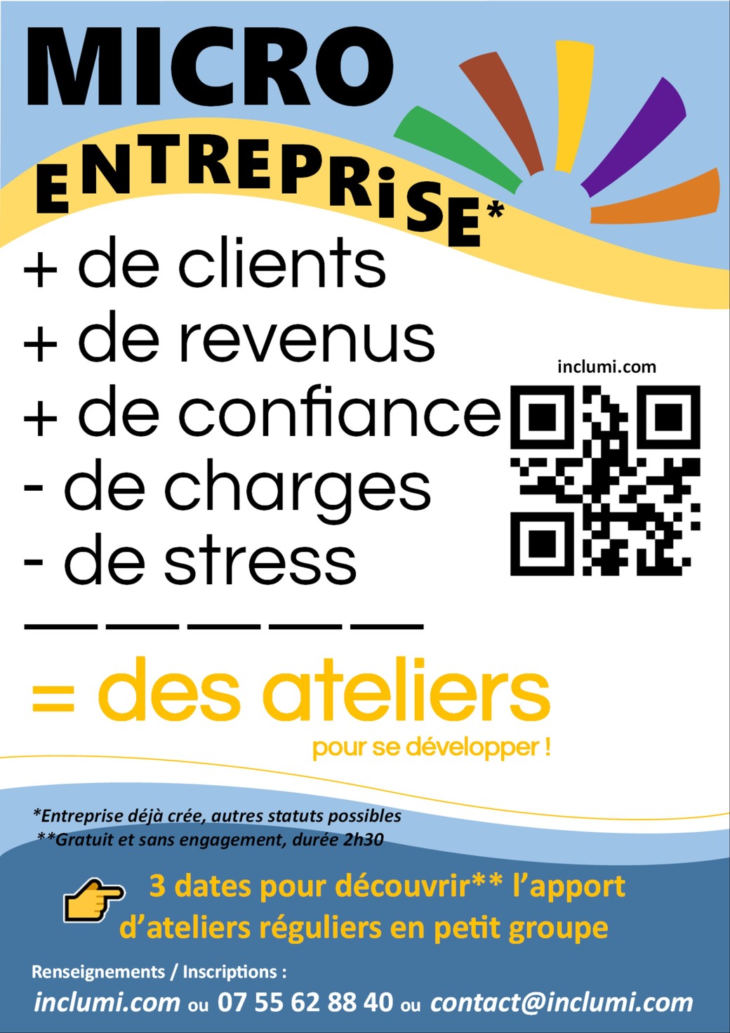 2026-03-03 09:00:00 2026-03-17 11:30:00 Europe/Paris Ateliers pour développer sa Micro - LA COTE ST ANDRE - Découverte Reservations on : https://www.billetweb.fr/la-cote-st-andre -- Votre activité est lancée mais vous avez besoin d'un coup de pouce par ex: trouver plus de clients, vous dégager un revenu correct, réduire vos charges, améliorer votre communication, vous organiser, retrouver confiance, ... besoin d'avoir des réponses fiables à vos questions.   Venez découvrir et vivre, sans engagement, sur une des dates ci-dessous un avant-goût des ateliers réguliers qui vous seront proposés à partir de fin mars. La Côte-Saint-André, France incLumi