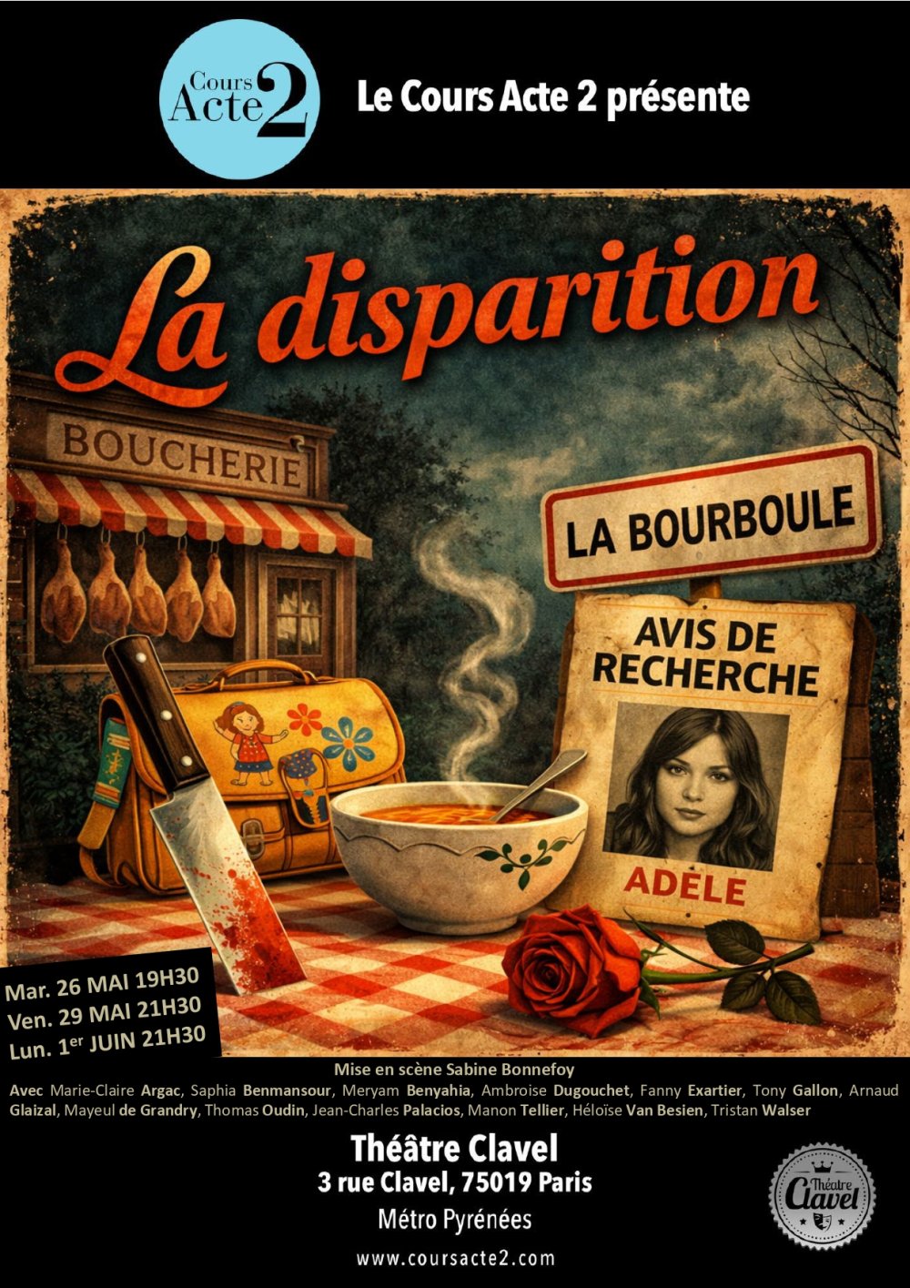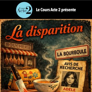2026-05-26 19:30:00 2026-06-01 21:30:00 Europe/Paris La Disparition Reservations on : https://www.billetweb.fr/la-disparition1 -- Un spectacle de Sabine Bonnefoy   La pièce : Adèle a disparu et c'est tout un village qui se retrouve en ébullition. Chacun y va bon train en hypothèses et en accusations. Des personnages hauts en couleurs et des situations aussi étonnantes que cocasses. Rires et surprises assurés !   Avec : Marie-Claire Argac, Saphia Benmansour, Meryam Benyahia, Ambroise Dugouchet, Fanny Exartier, Tony Gallon, Arnaud Glaizal, Mayeul de Grandry, Jean-Charles Palacios, Manon Tellier, Thomas Oudin, Heloïse Van Besien, Tristan Walser.   ---   Cours Acte 2 Cours de théâtre pour adultes amateurs à Paris.  On apprend mieux en s’amusant ! Théâtre Clavel, Rue Clavel, Paris, France Cours Acte 2