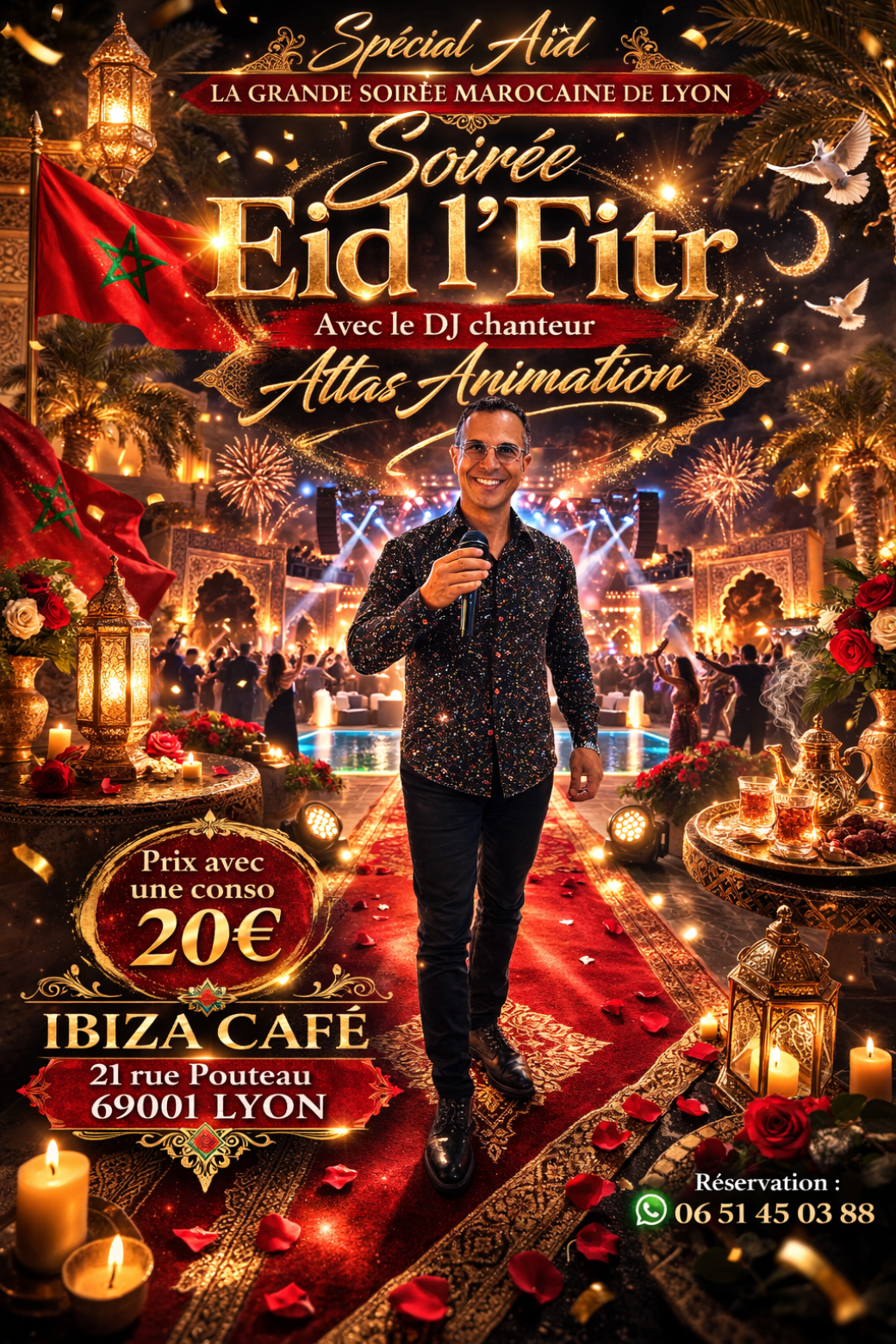 À l’occasion de l’Aïd, Atlas Animation vous invite à célébrer cette fête dans une ambiance chaleureuse et festive lors d’une soirée marocaine exceptionnelle au Ibiza Café – Lyon 1er.
