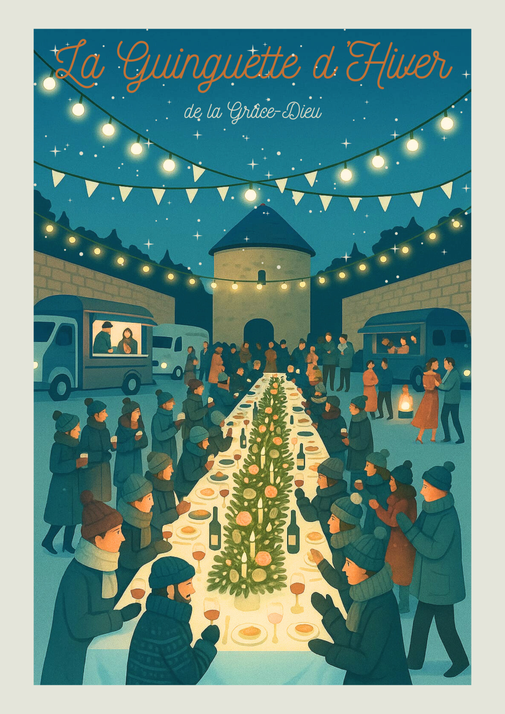 Le concept : Une Guinguette d'hiver, chaleureuse et conviviale, comme on les aime, où on se réunit, on trinque, on se régale, on rit, on chante, on danse, on s'amuse... Mais celle-ci, elle a un truc en plus : L'élégance ! Un lieu d'exception avec une âme, une décoration soignée, une offre de restauration locale et de qualité, une ambiance singulière... Vivez une expérience événementielle atypique qui joue des contrastes : Entre le sacré et le profane, entre solennité du passé et la simplicité de l'esprit guinguette, entre l'héritage intemporel et un événement éphémère, entre un concept estival à l'aube de l'hiver.