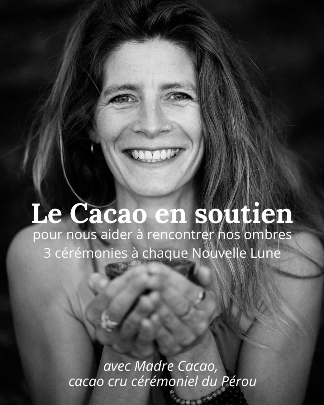 J'aurais une immense joie de vous partager également la sagesse du cacao cru, qui est une plante qui nous guidera dans la rencontre avec nos ombres lors des cercles de Nouvelle Lune. J'ai fondé ma propre marque de cacao il y a 3 ans, Madre Cacao, variété Criollo que j'importe du Pérou (cacao bio et éthique).